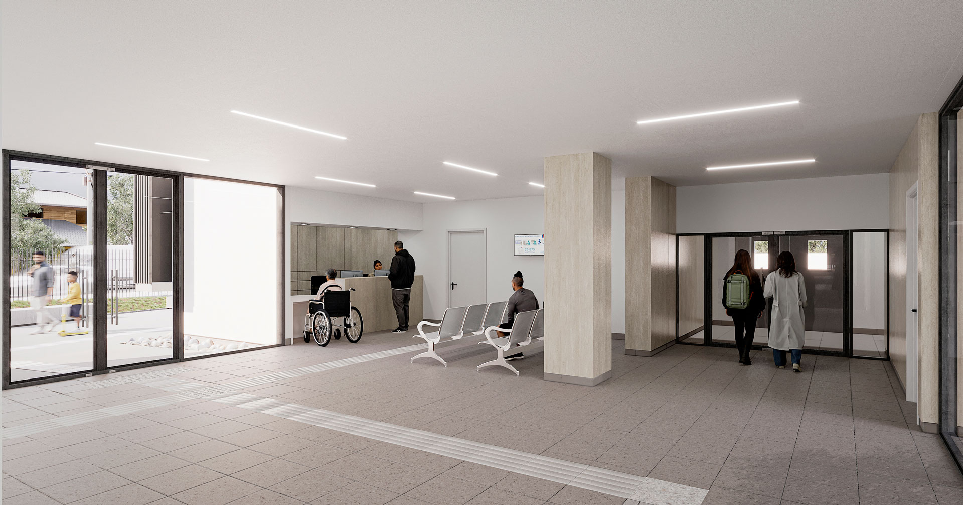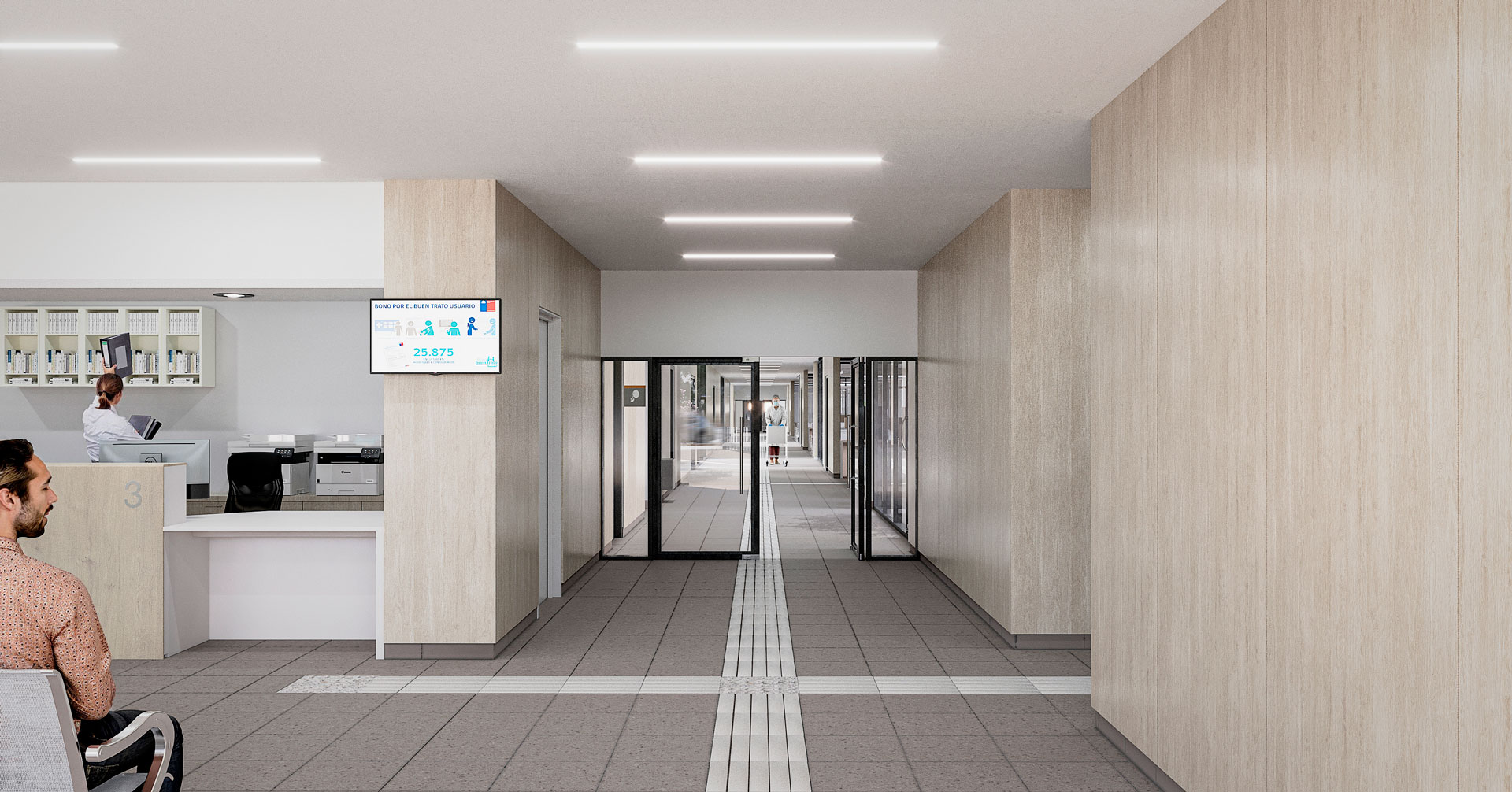 El acceso principal, concebido desde la esquina, conecta con un eje estructurante que actúa como columna vertebral del edificio; desde esa espina se ramifican los recorridos hacia las distintas unidades y recintos, ofreciendo una lectura clara y una secuencia de espacios que orientan a usuarios y equipo.