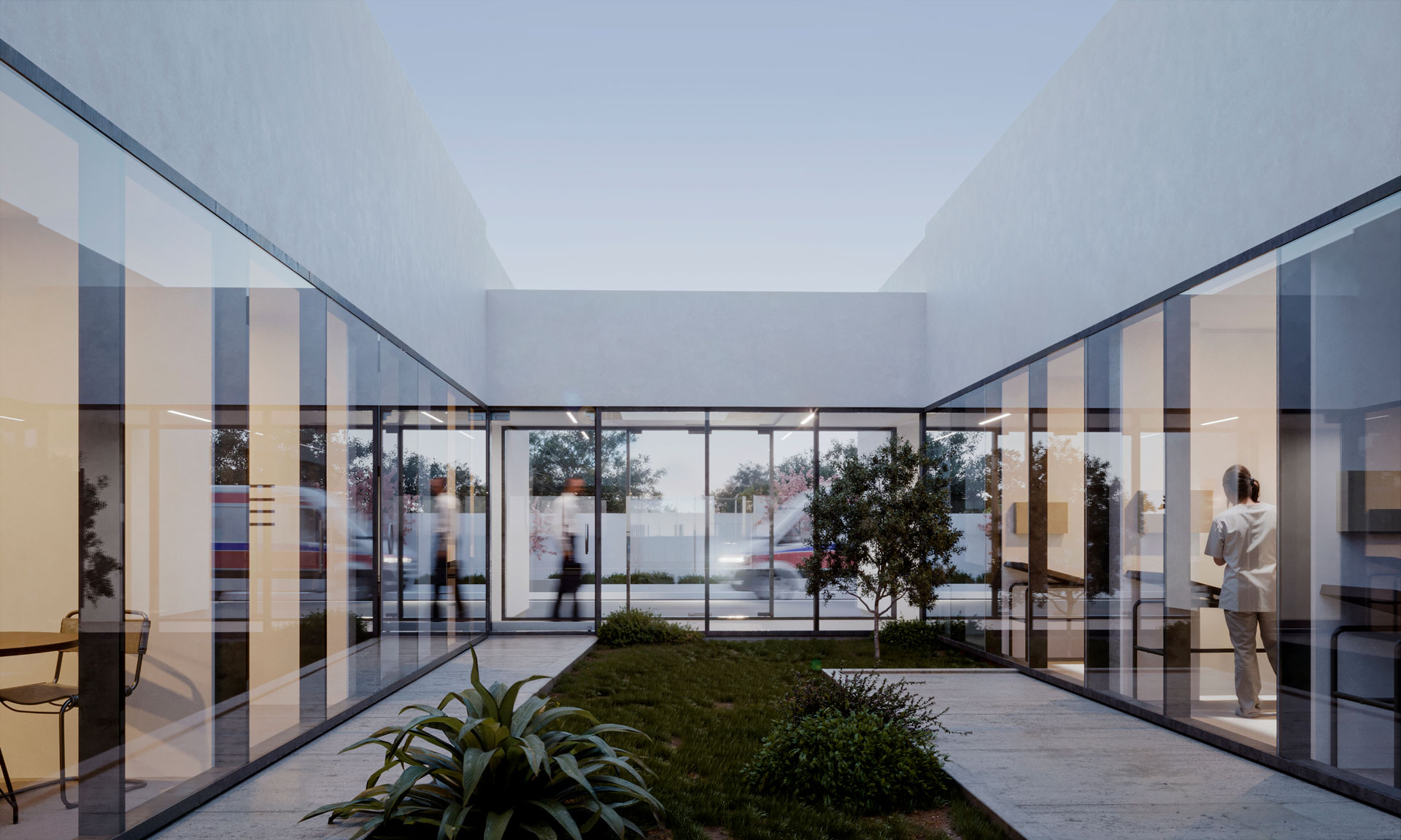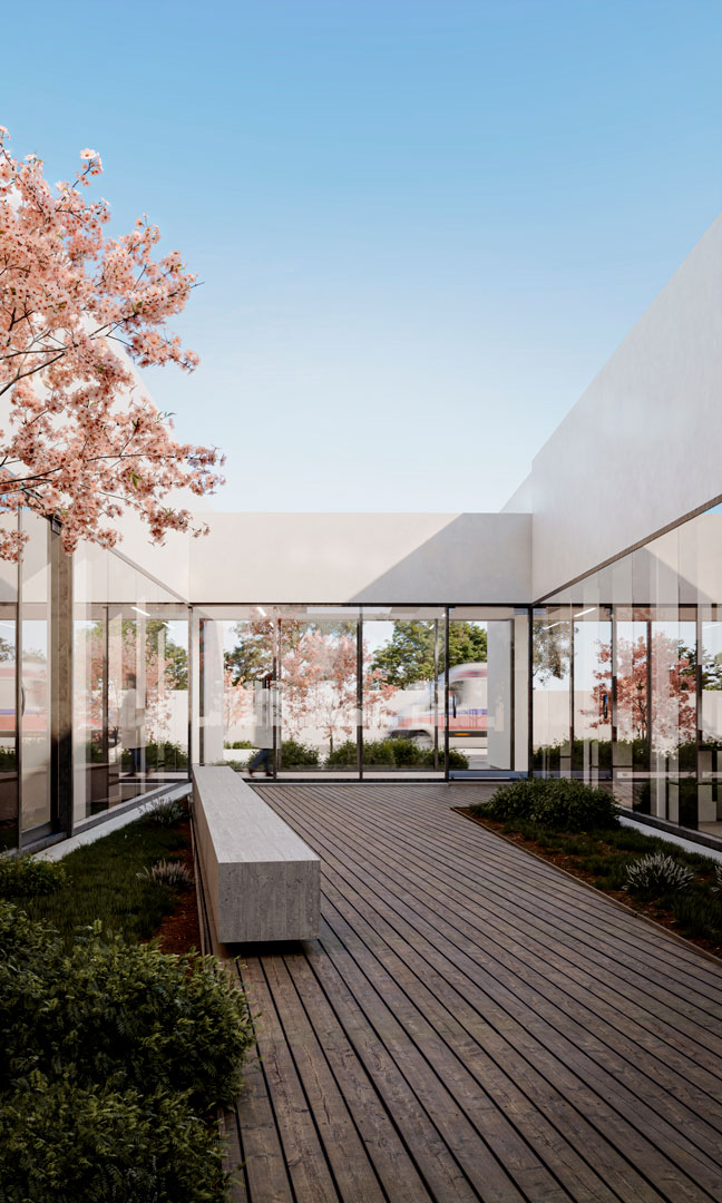 Los vacíos se emplean como dispositivos de espacialidad y de señalización: realzan los accesos, consolidan la esquina como hito urbano y permiten la conexión transversal entre volúmenes. Estos patios y cortes introducen luz, ventilación y visibilidad, transformando la geometría en un paisaje interior que articula las circulaciones.